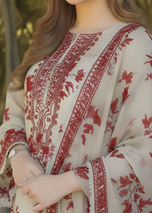 ANL Embroidered Cream & Red Floral Luxury Lawn Dress