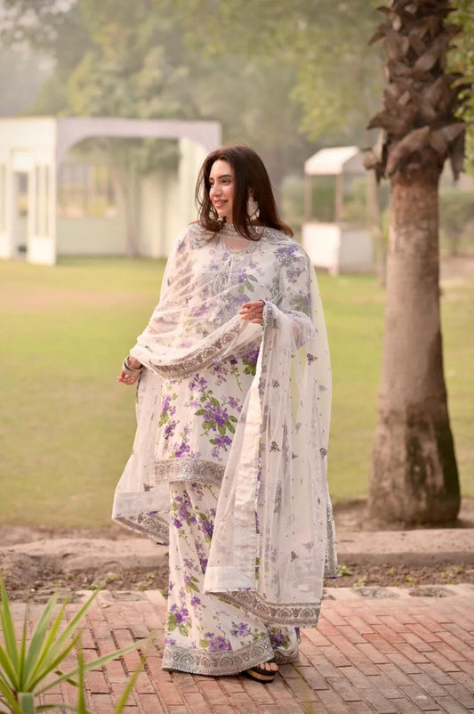 ANL Embroidered Cream n Purple Flowers Luxury Lawn Dress