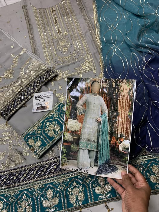 Fabric Details: Shirt Soft Chiffon With Sequence Work 2.5 Meter, Plain Malai Fabric Trouzer 2.5 Meter , Chiffon 4 side Border Ready to Wear Dupatta ( All Patches Included )