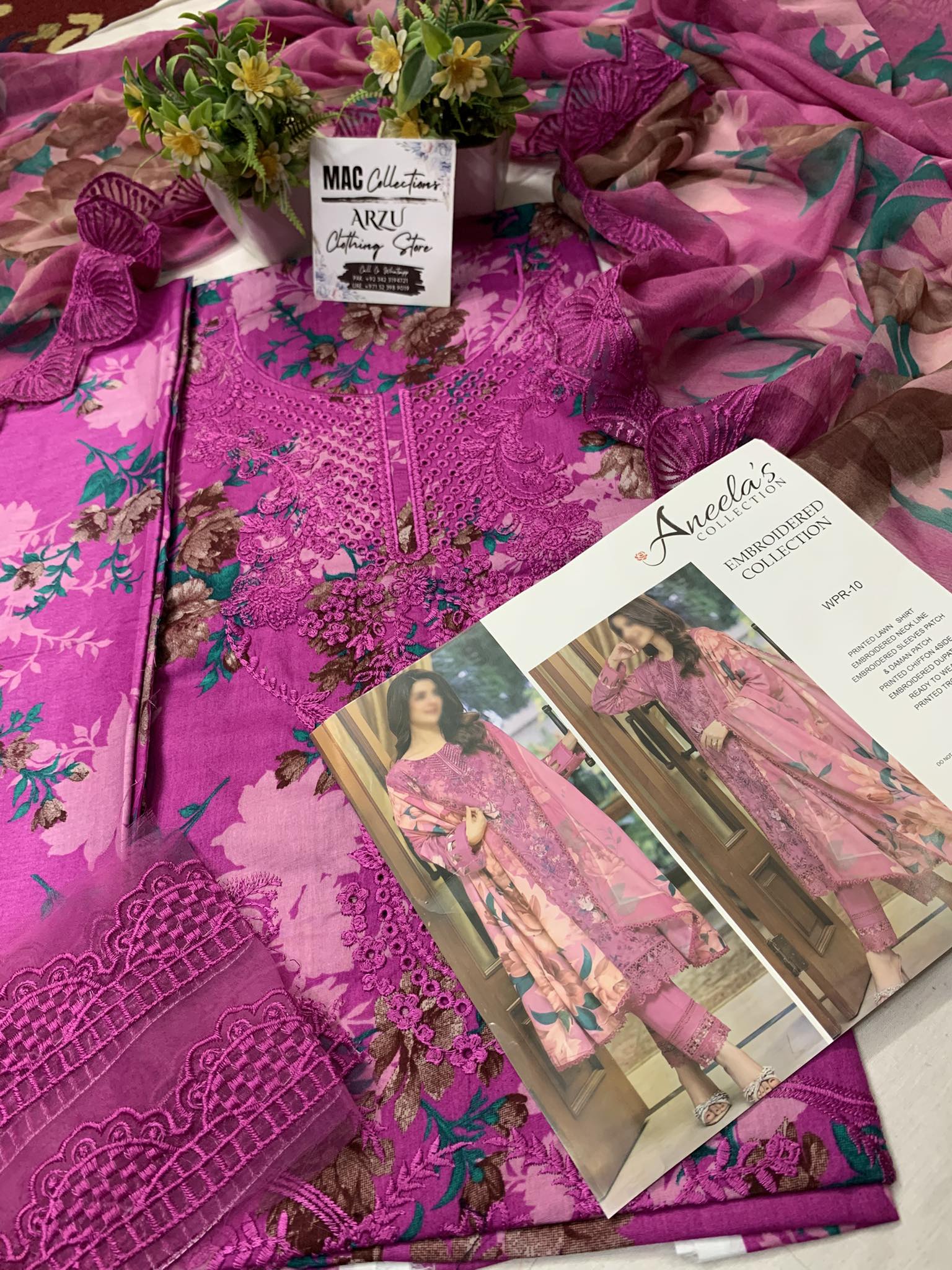 Fabric Detail: Unstitch Lawn Printed Shirt 2.5 Meter Thread work & Lawn Printed Trouser 2.5 Meter , Chiffon Ready to Wear Dupatta.(All Patches Included) Detailed Video Given.