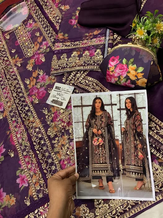 Fabric Details: Shirt Organza With Stone & Sequence Work 2.5 Meter With Silk Printed Inner, Silk Plain Trouzer 2.5 Meter , Organza 4 side Border Ready to Wear Dupatta ( All Patches & Hand Clutch Included )