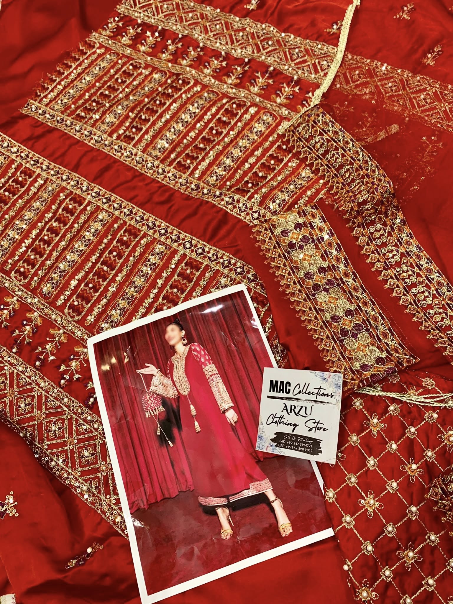 Shamoz Silk Embroidered Shirt With Hand Work 2.5 Meter , Silk Plain Trouzer 2.5 Meter , Ready to Wear Net Dupata With 4 Side Bordered 2.5 Meter, Embroidered Purse and All patches Included .